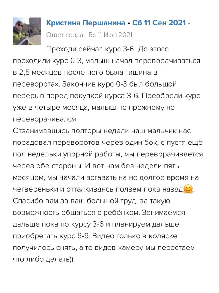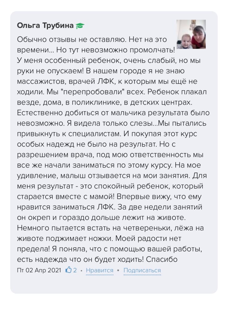 После анализа Игорь Анатольевич подготовит индивидуальные рекомендации по занятиям и играм с малышом, по обустройству комнаты. Эти рекомендации будут учитывать особенности двигательного и сенсорного развития ребёнка.